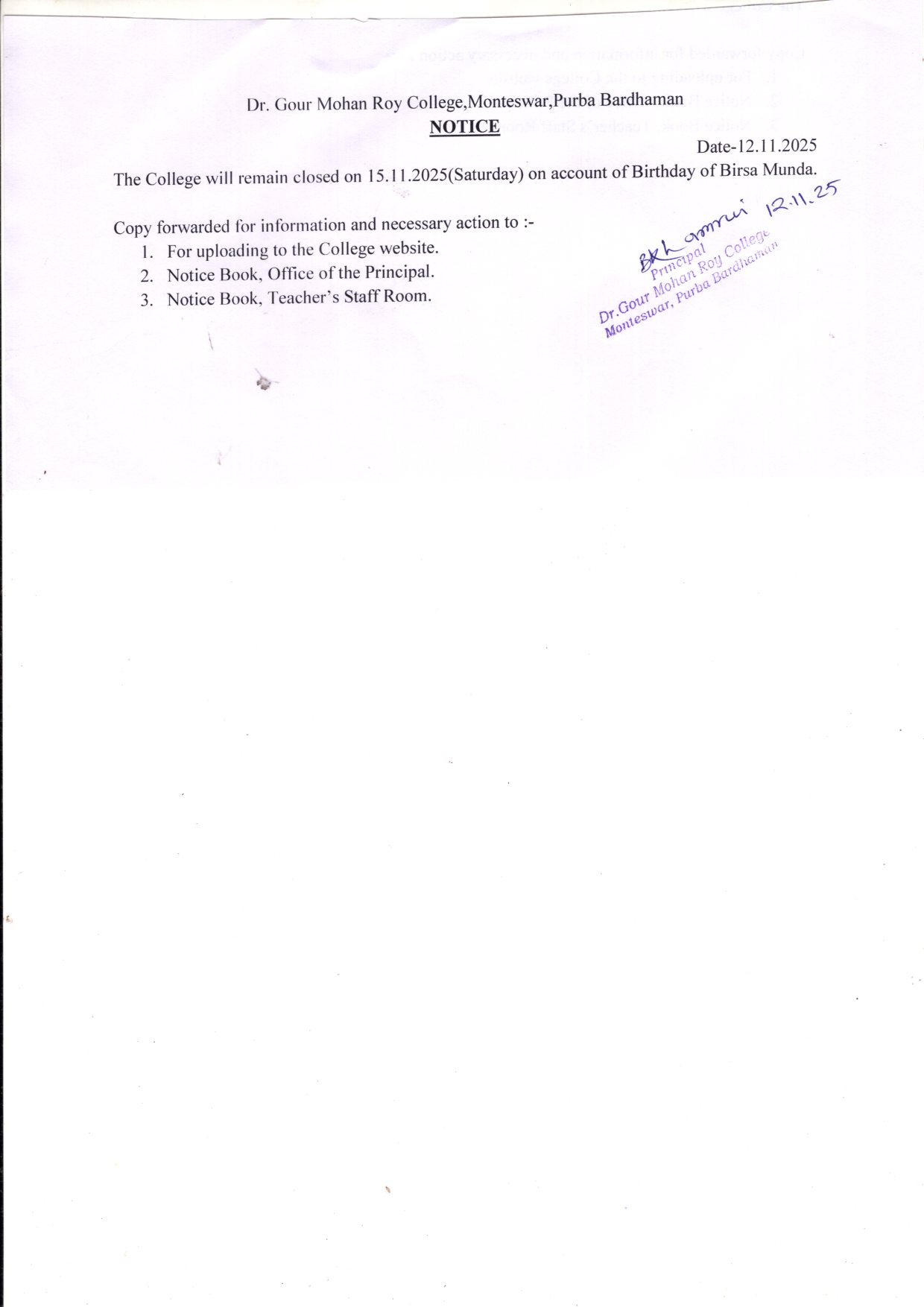 HOLIDAY NOTICE ON ACCOUNT OF KARAM PUJA & FATEHA-DWAZ-DAHAM |